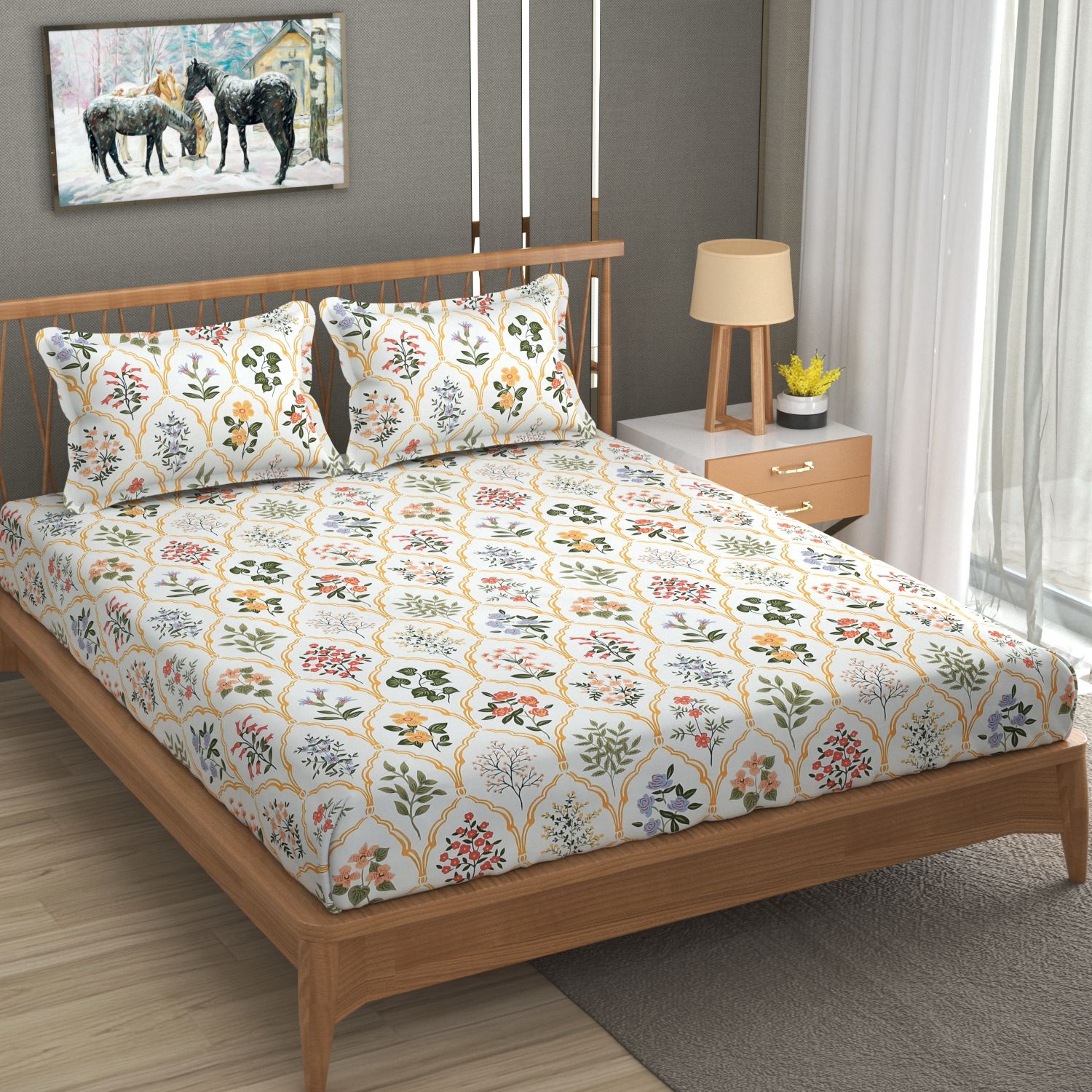 Fabicra Elegant Floral Cotton Elastic Fitted King Size Double Bed Bedsheet with 2 Pillow Covers